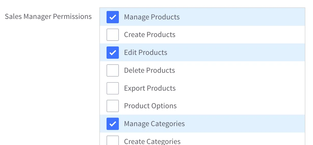 Check “Manage Products”, “Edit Products”, “Manage Categories” and “Manage Brands” on Sales Manager Permissions.