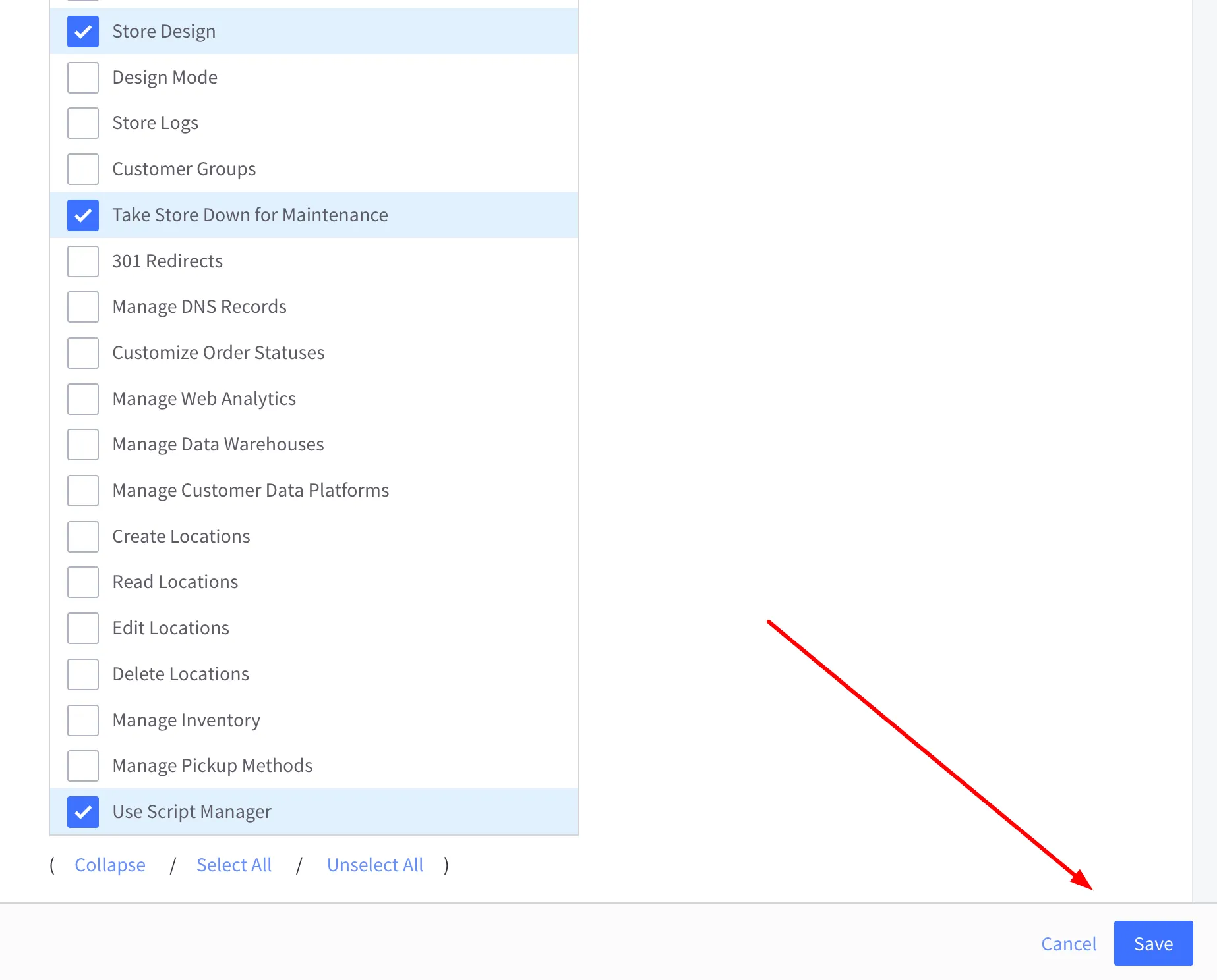 Check “Store Design”, “Take Store Down for Maintenance” and “Use Script Manager” on System Admin Permissions.