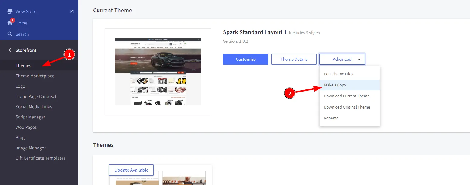 Section titled “1. Navigate to Storefront → Themes and make a copy of your current theme”