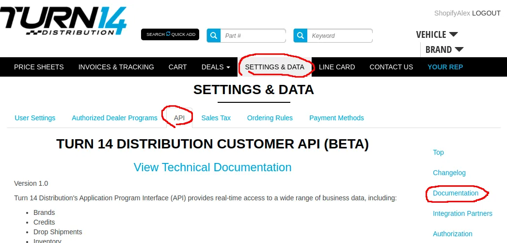 - Click on “Settings & Data” in the top menu here: https://turn14.com/options.php