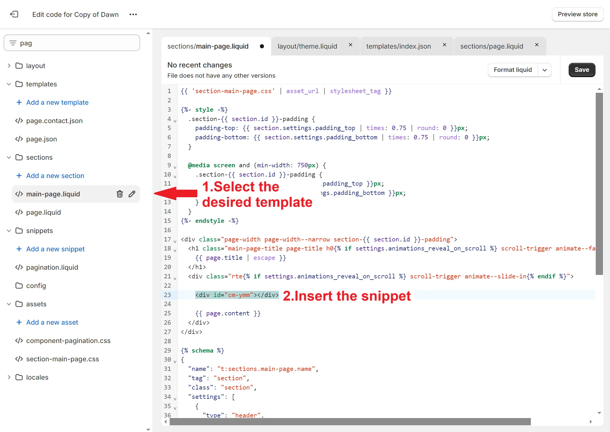 Section titled “Add Carousel and Grid Block”- Go to your theme code editor: Admin → Sales channels → Online Store → Themes → (on the desired theme) ⋯ → Edit code
