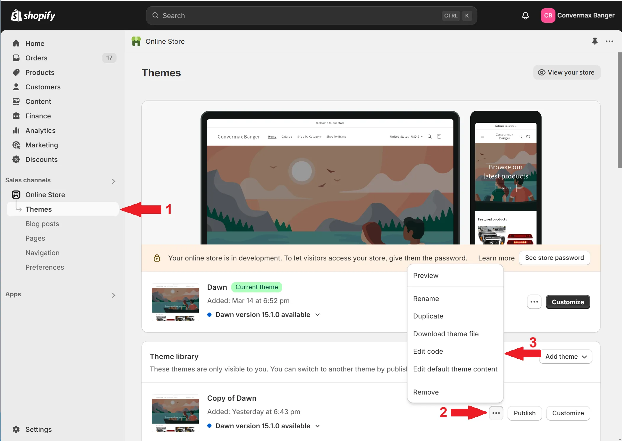 - Go to your theme code editor: Admin → Sales channels → Online Store → Themes → (on the desired theme) ⋯ → Edit code