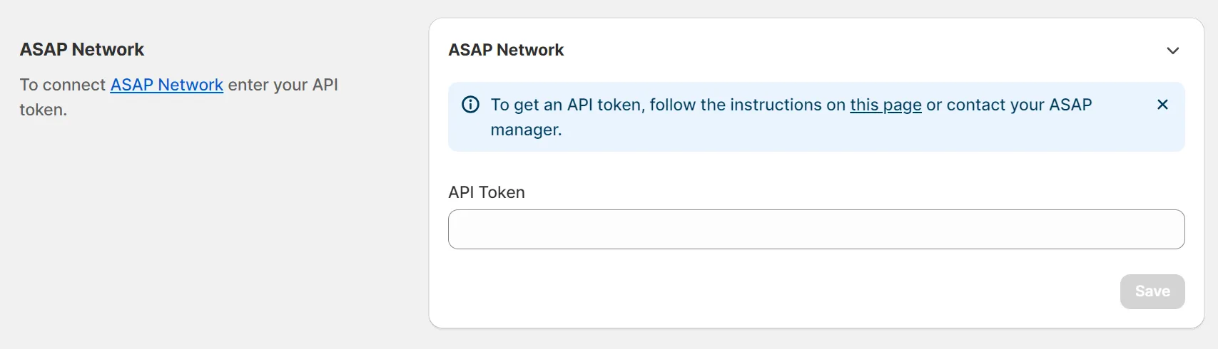 You can connect your ASAP account to the app. Go to the ASAP API page and log in to your account. Follow the instructions to generate your API token or ask for help from your ASAP manager. Enter the token in the blank field and confirm by clicking Save.