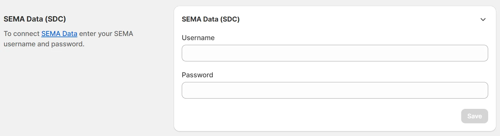 Section titled “SEMA Data (SDC)”Our app has a connection with SEMA Data - you just need to enter your SEMA username and password to generate an API token.