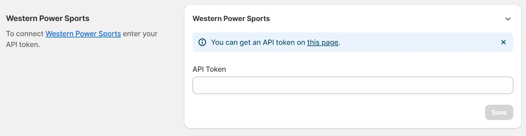 Section titled “WPS (Western Power Sports)”If you have a WPS account, you can connect it to the app to pull fitment data. Go to the WPS website, log into your account, and copy your API token. Enter it in the blank field and confirm by clicking Save.