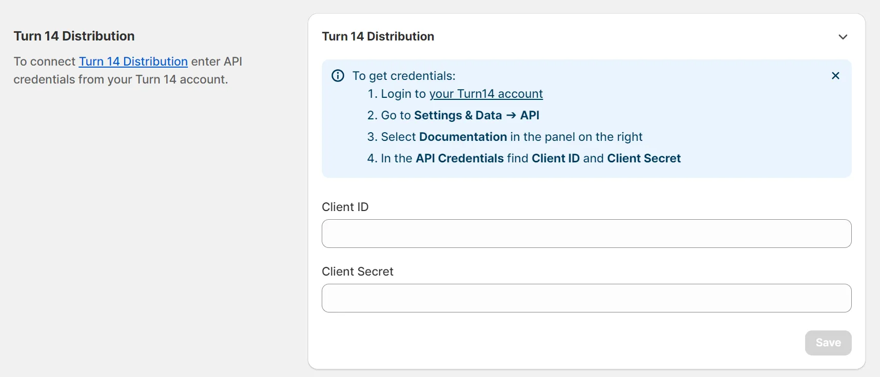 Go to the Turn 14 website and sign in to your account. Go to Settings & Data → API → Documentation. Find your Client ID and Client Secret on the API Credentials page, and copy them. Please return to the app configuration, enter them in the blank fields, and confirm by clicking Save.