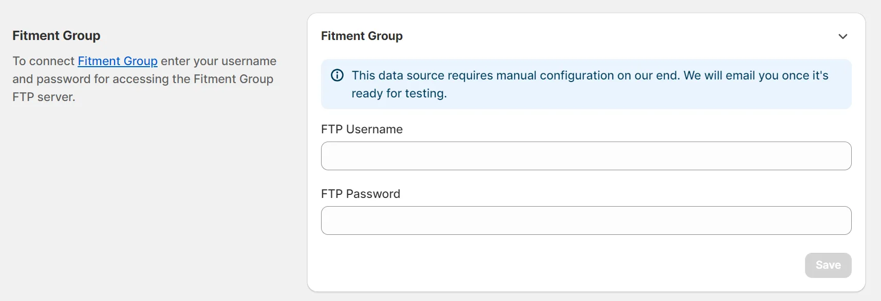 Section titled “Fitment Group”You can connect your Fitment Group account to the Year Make Model Fitment Search app, but this data source requires manual configuration on our end. We will email you once it’s ready for testing.