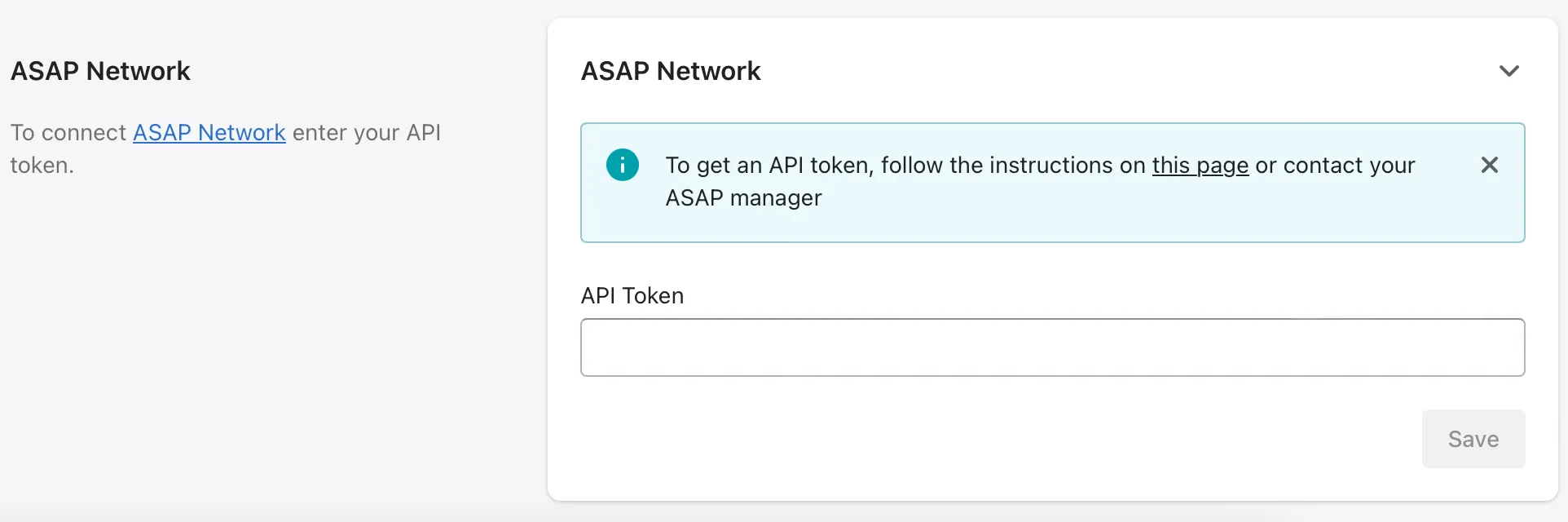You can connect your ASAP account to the app. Go to the ASAP API page and log in to your account. Follow the instructions to generate your API token or ask for help from your ASAP manager. Enter the token in the blank field and confirm by clicking Save.