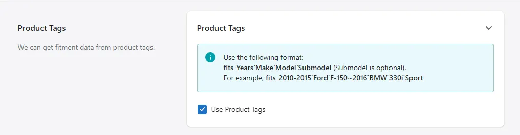 Then you can go to product metafields and assign the fitment data as shown in the example.