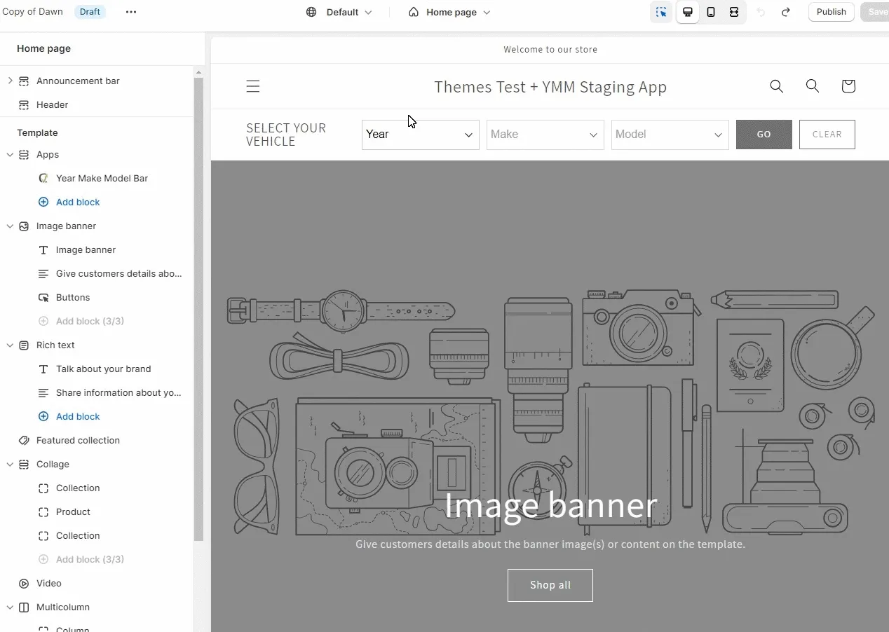 Section titled “Year-Make-Model Lookup”If you have a Shopify Online Store 2.0 theme, it is easy to implement Garage inside the Theme editor.