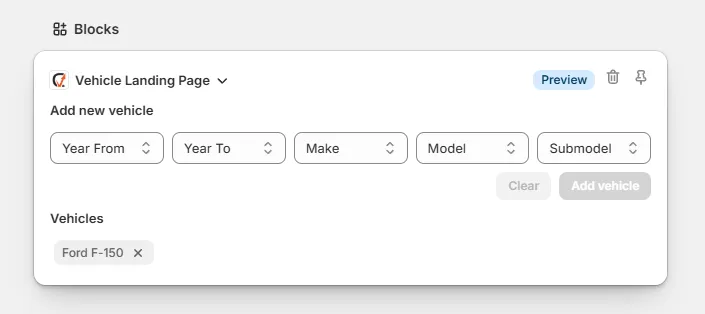 - Scroll down to the Blocks section and select the Vehicle Landing Page block.